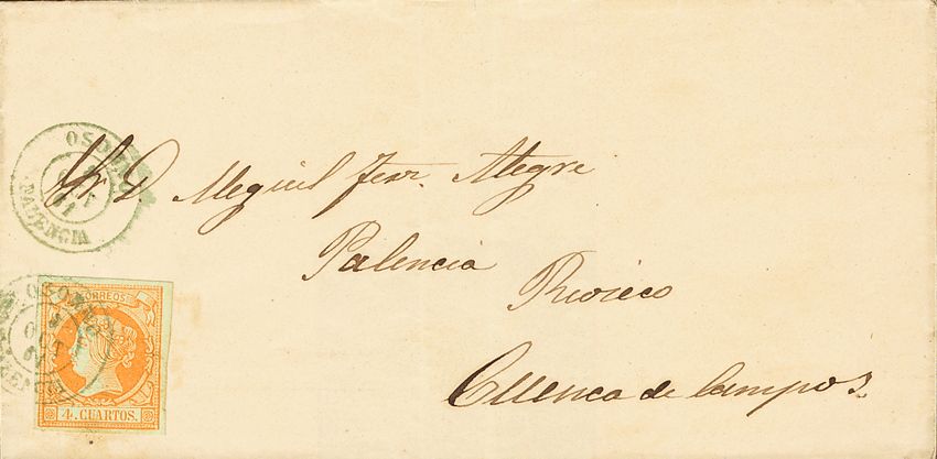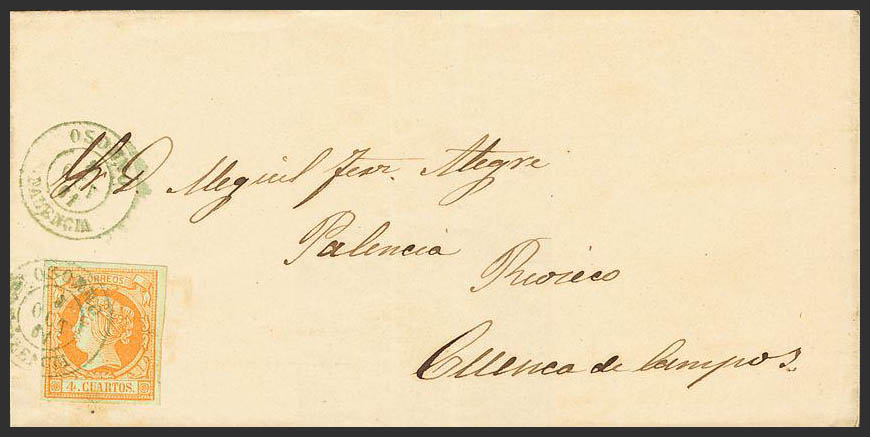52. 1861. 4 cuartos amarillo. OSORNO a CUENCA. Matasello OSORNO / PALENCIA, en azul. MAGNIFICA Y MUY RARA.