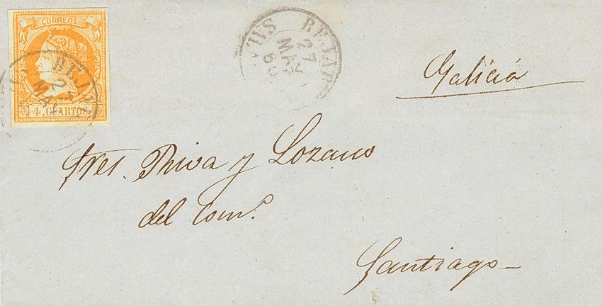 52. 1860. 4 cuartos naranja. BEJAR a SANTIAGO. Matasello BEJAR / SALAMANCA. MAGNIFICA.