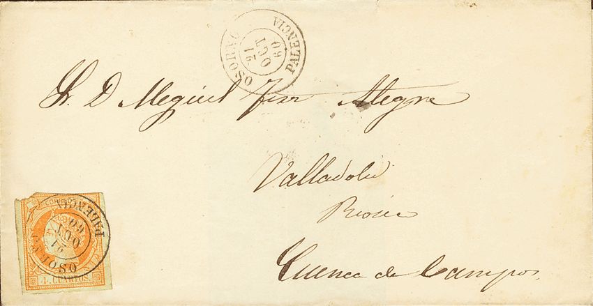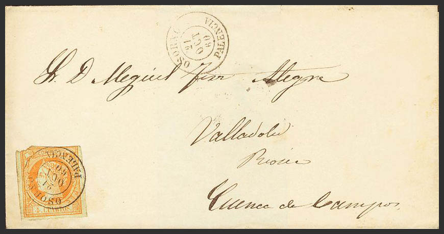 52. 1860. 4 cuartos naranja. OSORNO a VALLADOLID. Matasello OSORNO / PALENCIA. MAGNIFICA.