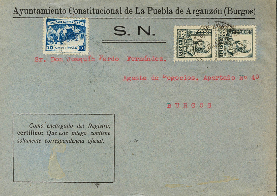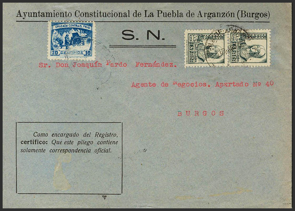 820(2). 1938. 15 cts pizarra, pareja y 10 cts de Cruzada Contra el FrÃo. PUEBLA DE ARGANZON a BURGOS. Al dorso llegada. MAGNIFICA.