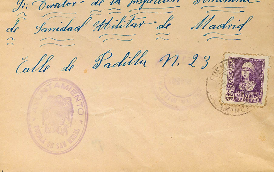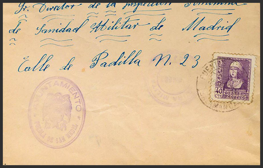 858. 1939. 40 cts violeta. FUENTES DE BEJAR a MADRID. En el frente marca AYUNTAMIENTO / PUEBLA DE SAN MEDEL. MAGNIFICA.