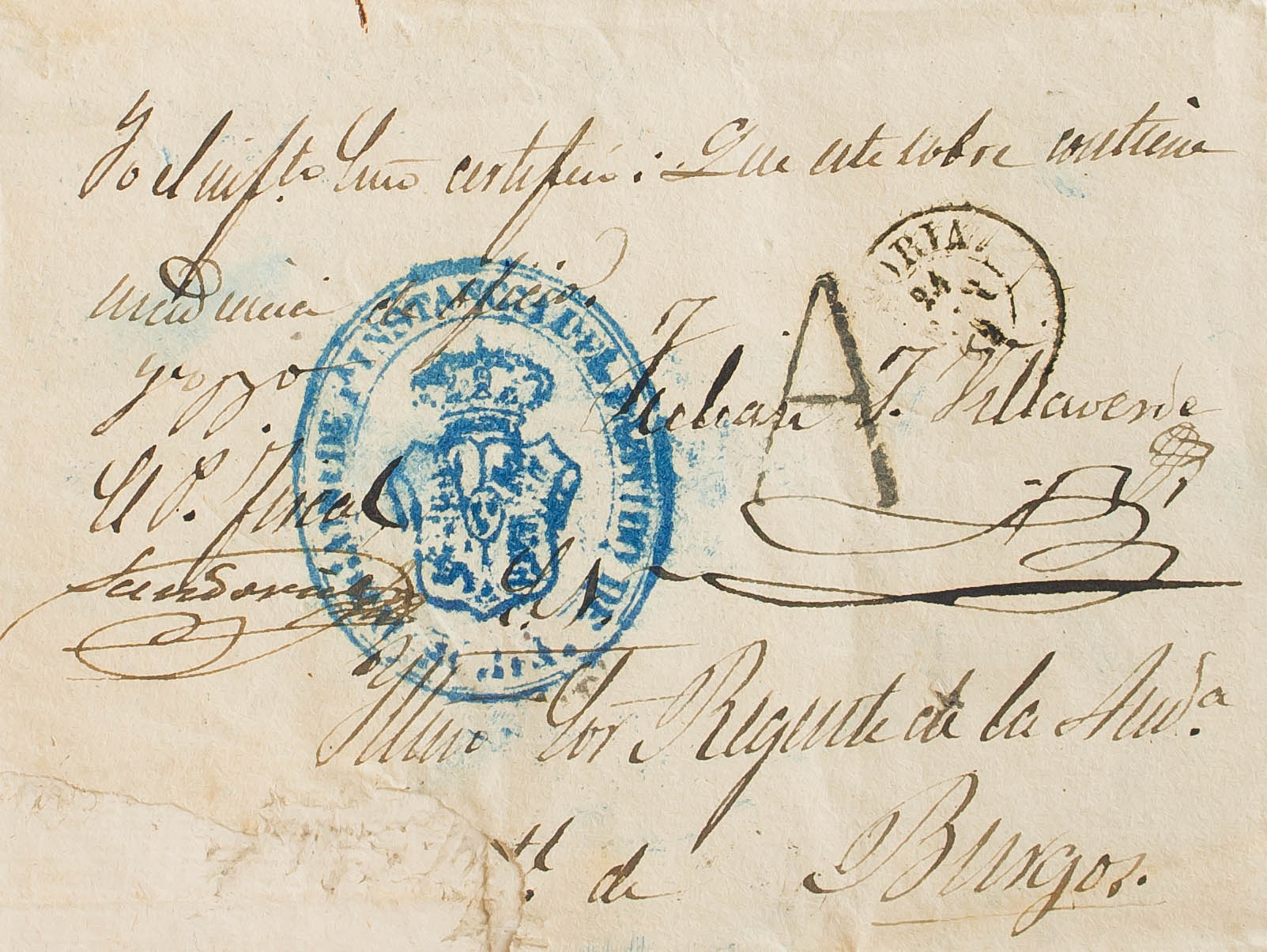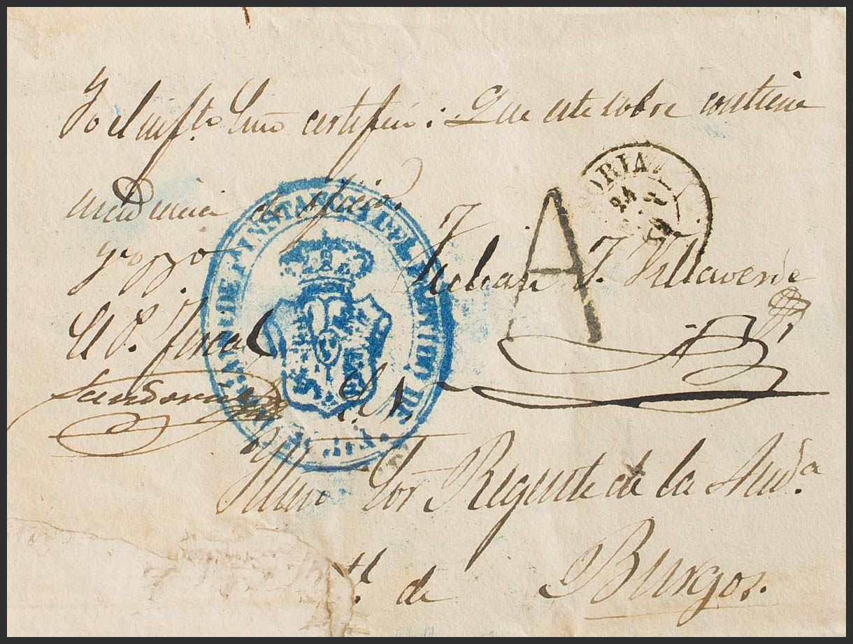 1862. SORIA a BURGOS (con una pequeña restauración en una esquina). Marca del Juzgado de Soria, en azul y "A" de Abono, en negro y aplicada en Soria (P.E.26) edición 2004. MAGNIFICA.