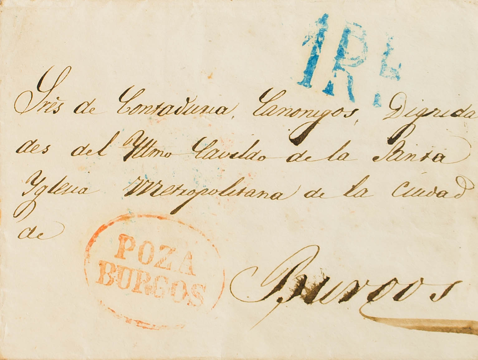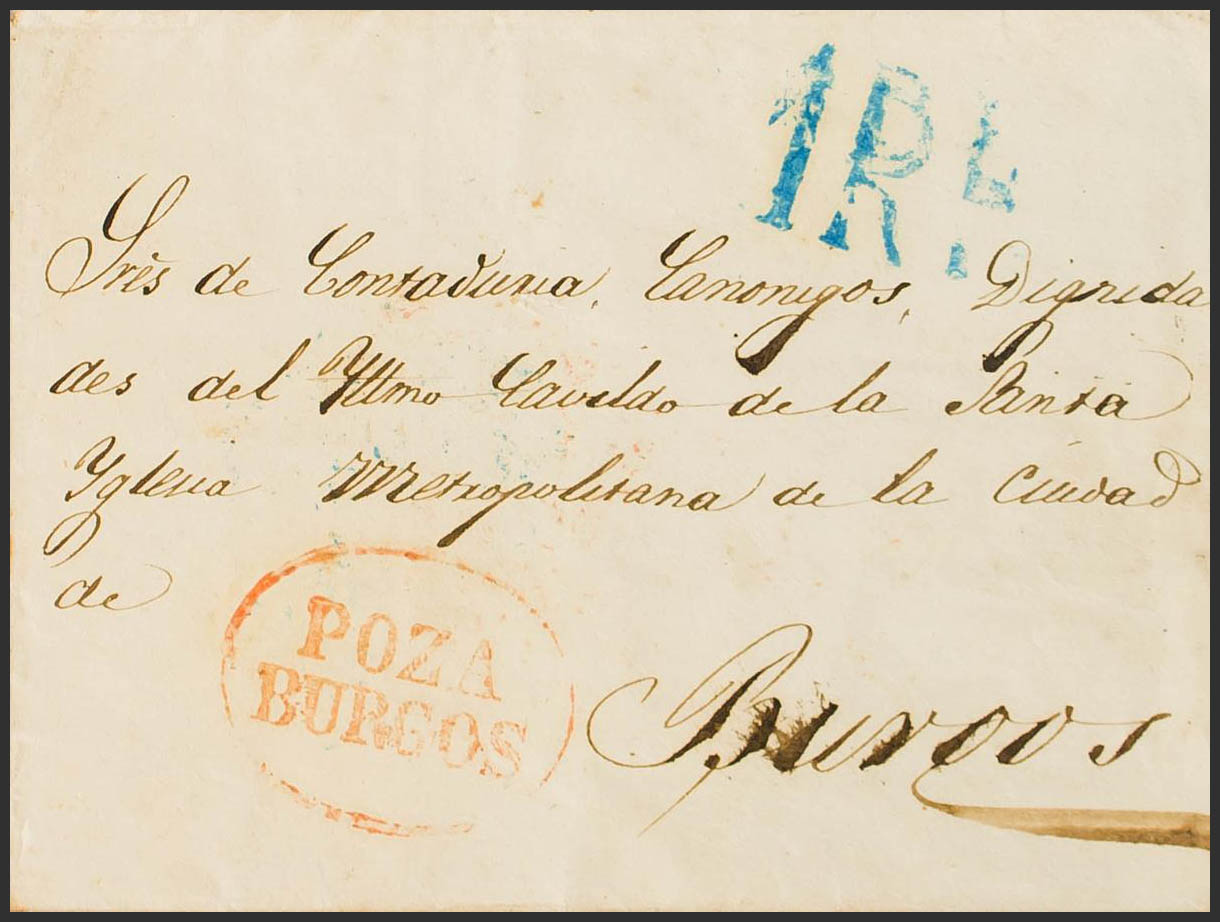 1850. POZA DE LA SAL a BURGOS. Marca POZA / BURGOS, en rojo (P.E.1) edición 2004 (al dorso marca de llegada a Burgos denominada "Anagrama de Burgos", en azul) (esta marca fue empleada posteriormente como matasellos del 6 cuartos negro de 1850). MAGNIFICA Y Y MUY RARA.
