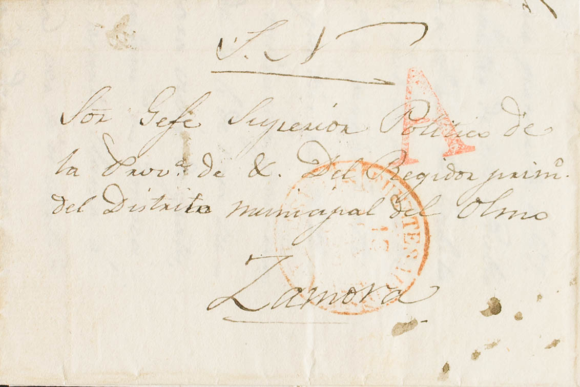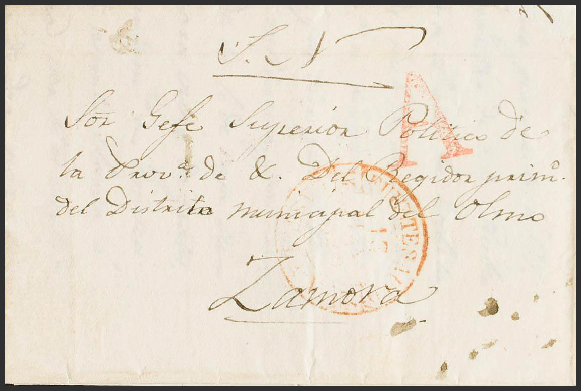 1848. OLMO a ZAMORA. Marca "A", en rojo de abono de Zamora aplicada a la llegada (P.E.15) edición 2004 y baeza FUENTESAUCO / CAST. LA V. MAGNIFICA Y RARA.
