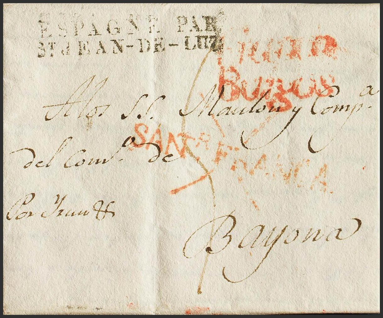 1830. SANTANDER a BAYONA (FRANCIA). Marca SANR. FRANCA (P.E.16) edición 2004 y FRANCA / BURGOS, en rojo y en tránsito (P.E.18) edición 2004. MAGNIFICA Y RARA.