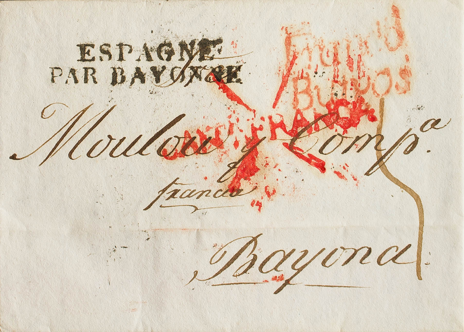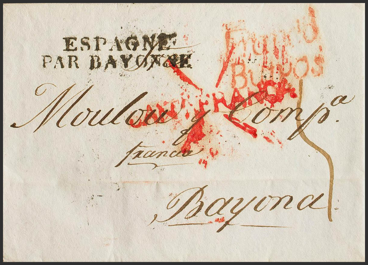 1826. SANTANDER a BAYONA (FRANCIA). Marca SANR. FRANCA (P.E.16) edición 2004 y FRANCA / BURGOS, en rojo y en tránsito (P.E.18) edición 2004. MAGNIFICA Y RARA.