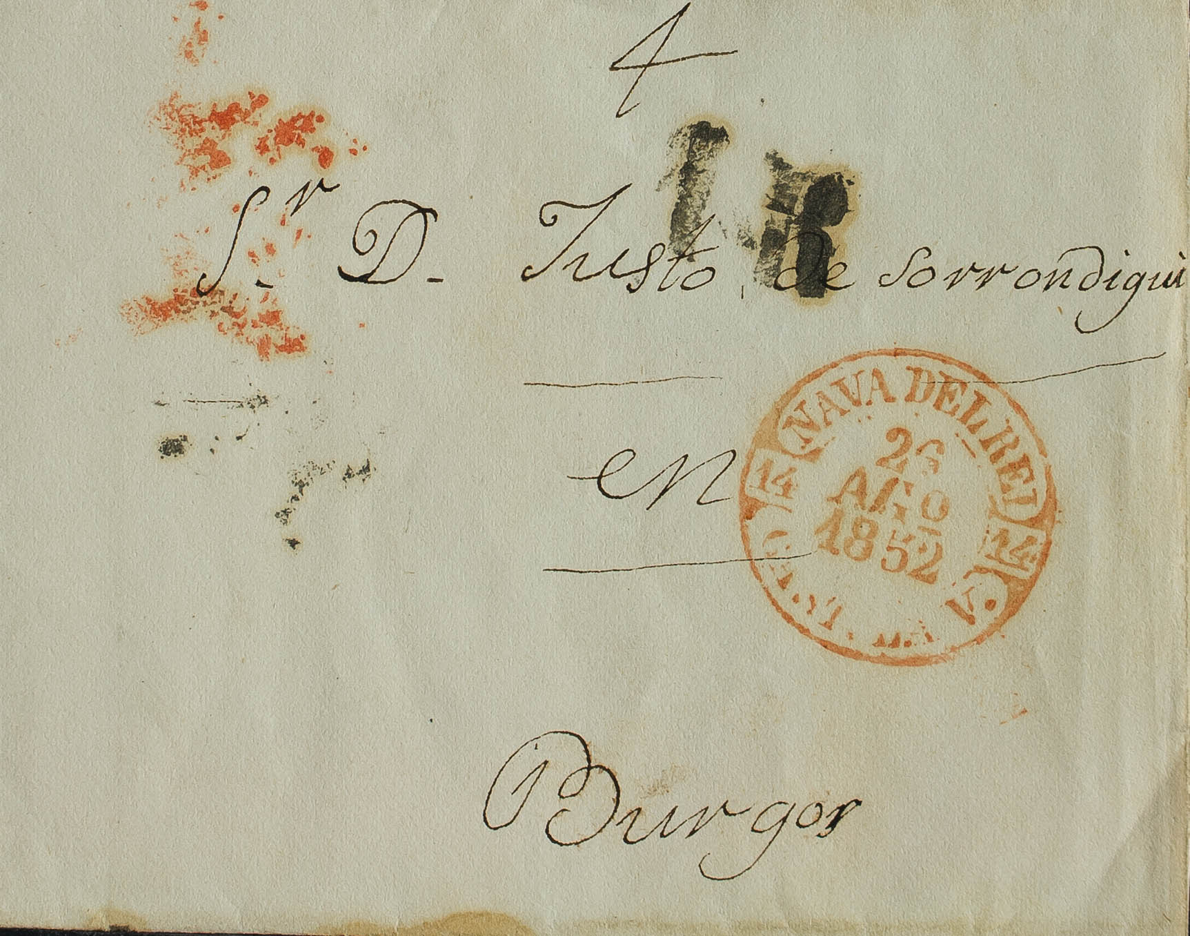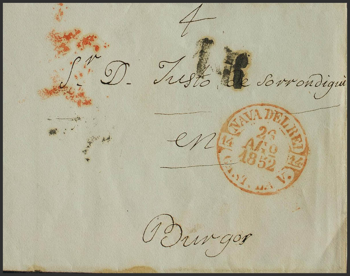 1852. NAVA DEL REY a BURGOS. Baeza NAVA DEL REY / CAST. LA V., en rojo. MAGNIFICA. Al dorso marca de llegada BURGOS (P.E.32) edición 2004. MAGNIFICA.