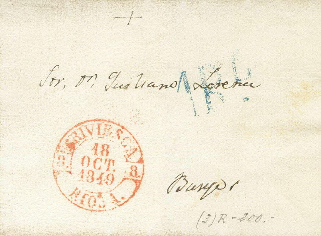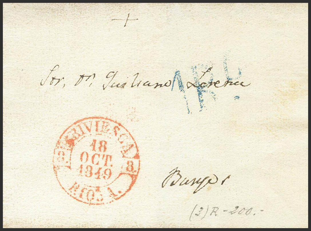 1849. BRIVIESCA a BURGOS. Baeza BRIVIESCA / RIOJA, en rojo y al dorso marca BS, en azul de Burgos, aplicada a la llegada. MAGNIFICA ESTAMPACION.