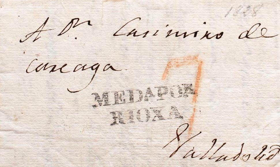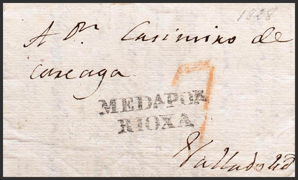 1828. MEDINA DE POMAR a VALLADOLID. Marca MEDª POR / RIOXA, en negro (P.E.3) edición 2004. MAGNIFICA.