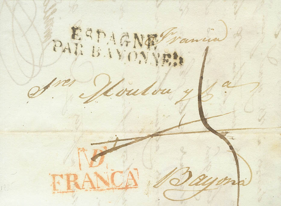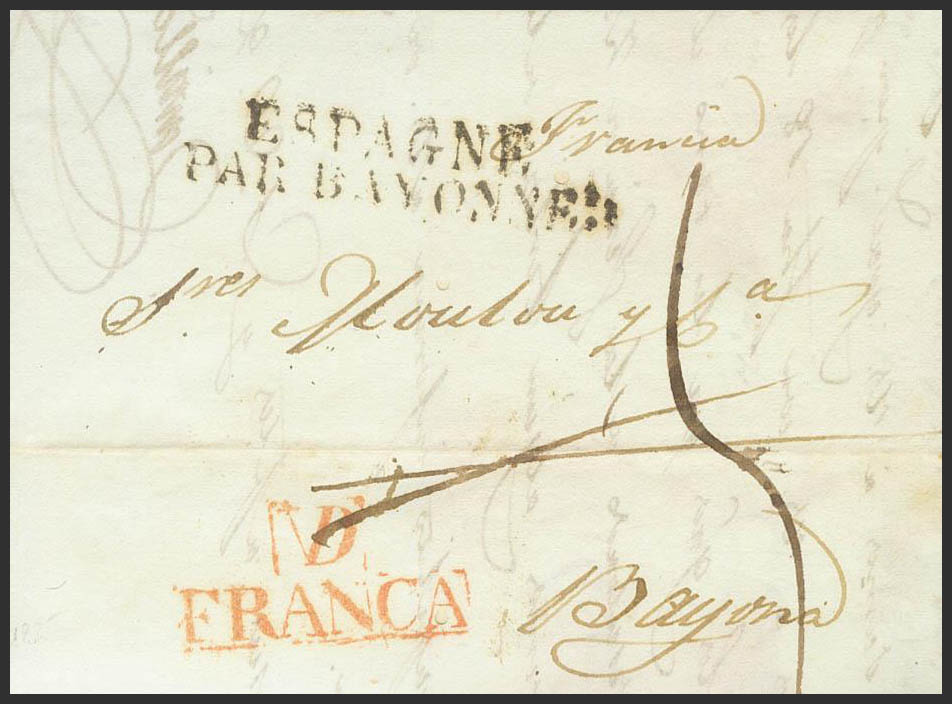 1825. VALLADOLID a BAYONA (FRANCIA). Marca VD. / FRANCA, en rojo (P.E.24) edición 2004. MAGNIFICA Y MUY RARA, ESPECTACULAR ESTAMPACION.