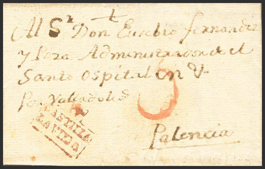 Castilla y León. Prefilatelia. 1820. ROA a PALENCIA. Marca P. / CASTILLA / LA VIEJA, en rojo.