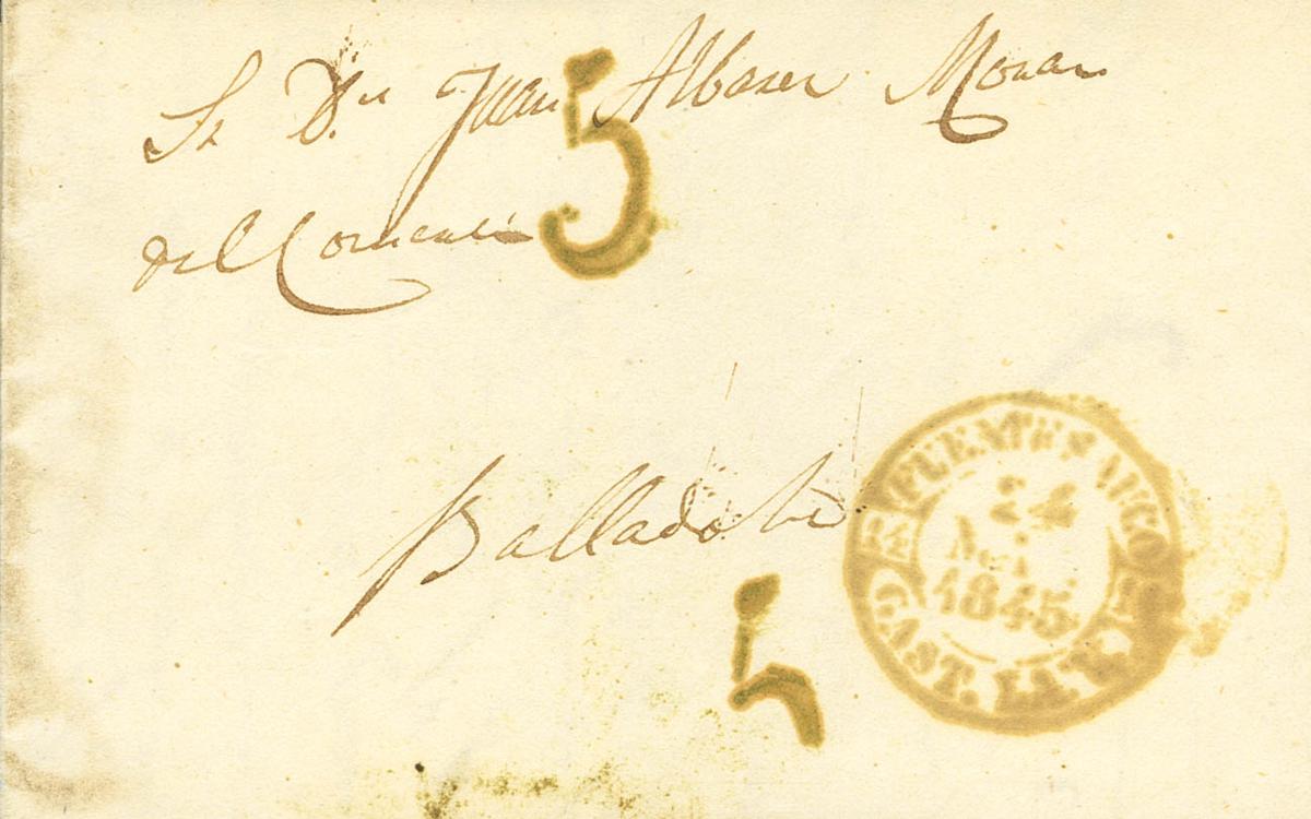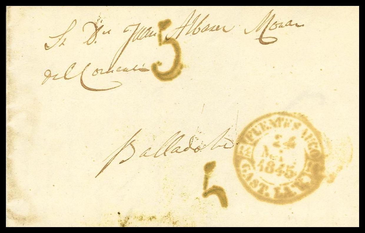 1845. FUENTESAUCO a VALLADOLID. Baeza FUENTESAUCO / CAST.LA V., en verde. MAGNIFICA Y RARA.