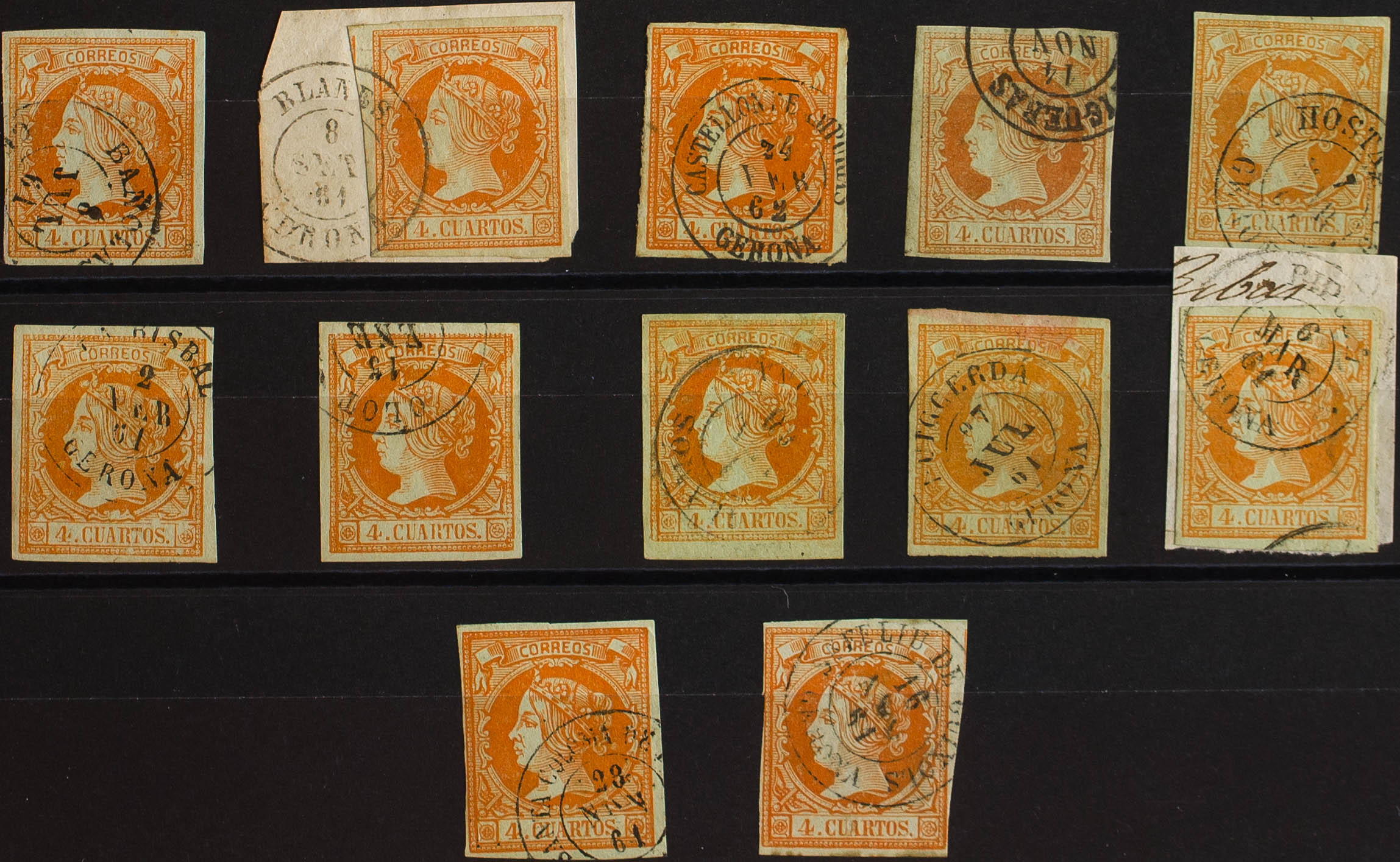 52(12). 1860. Conjunto de doce sellos del 4 cuartos amarillo inutilizados con los fechadores de la provincia de Gerona: BAÑOLAS, BLANES, CASTELLON DE AMPURIAS, FIGUERAS, HOSTALRICH, LA BISBAL, OLOT, PALAMOS, PUIGCERDA, RIPOLL, SANTA COLOMA DE FRANES y SAN FELIU DE GUIXOLS. MAGNIFICO.