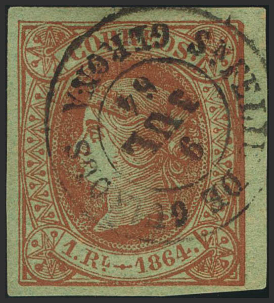 67. 1864. 1 real castaño. Matasello SAN FELIU DE GUIXOLS / GERONA. MAGNIFICO.