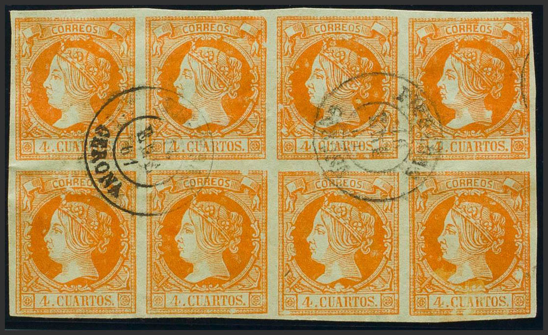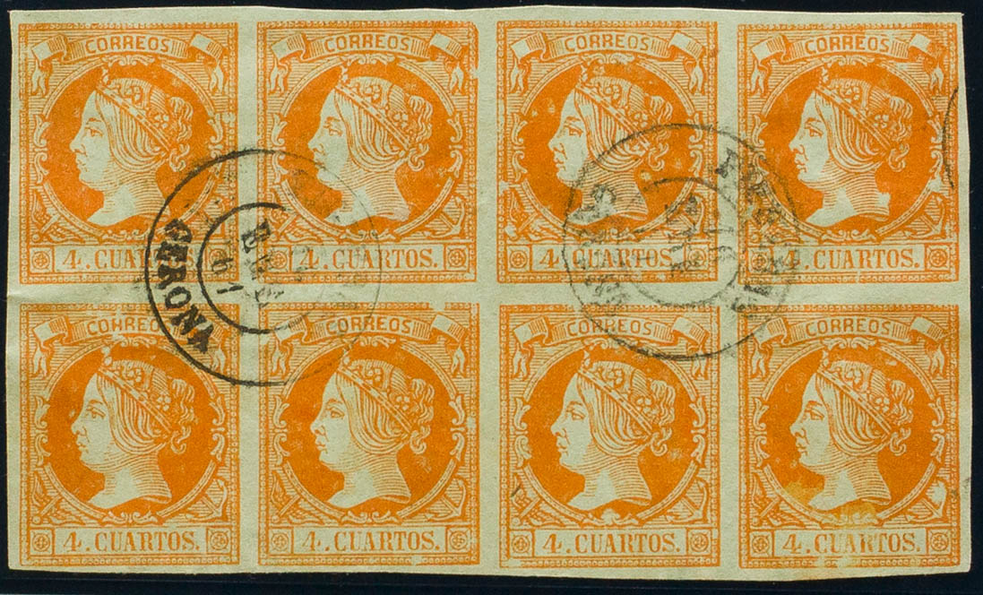 52(8). 1860. 4 cuartos naranja, bloque de ocho. Matasello FIGUERAS / GERONA. MAGNIFICO.