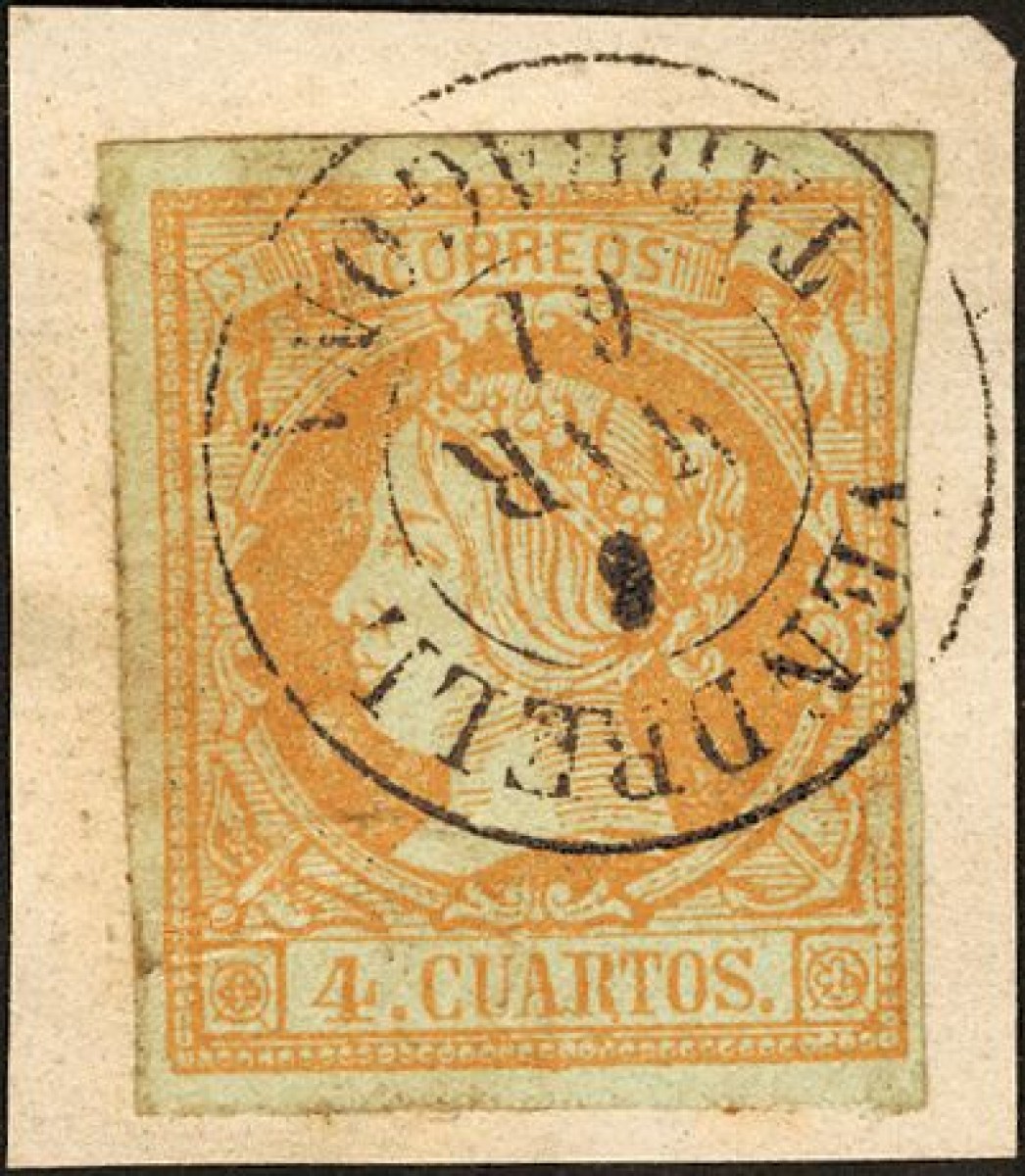 △ 52. 1860. 4 cuartos amarillo, sobre fragmento. Matasello VENDRELL / TARRAGONA. LUJO.
