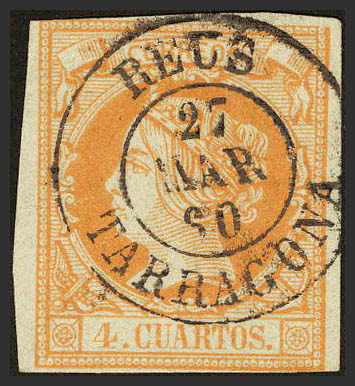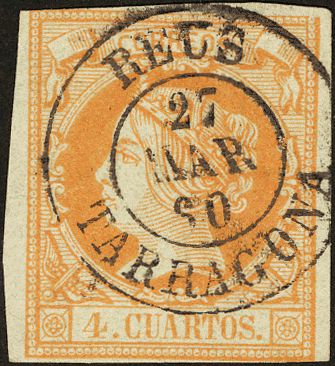 52. 1860. 4 cuartos amarillo. Matasello REUS / TARRAGONA. MAGNIFICO.