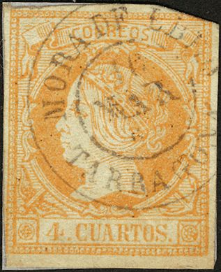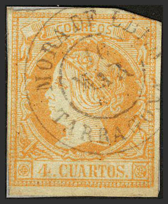 △ 52. 1860. 4 cuartos amarillo, sobre fragmento. Matasello MORA DE EBRO / TARRAGONA.