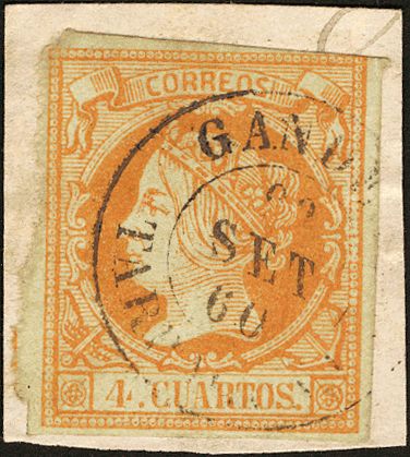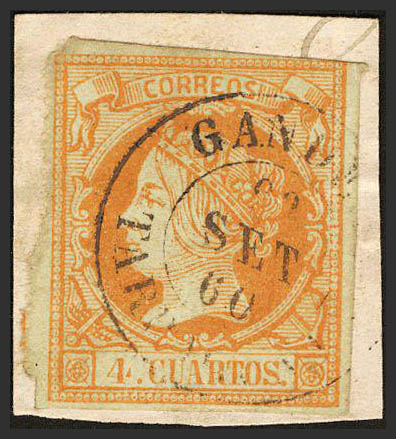 △ 52. 1860. 4 cuartos amarillo, sobre fragmento. Matasello GANDESA / TARRAGONA.