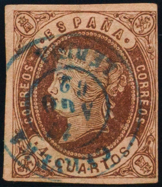 58. 1862. 4 cuartos castaño. Matasello CERVERA / LERIDA, en azul. MAGNIFICO.