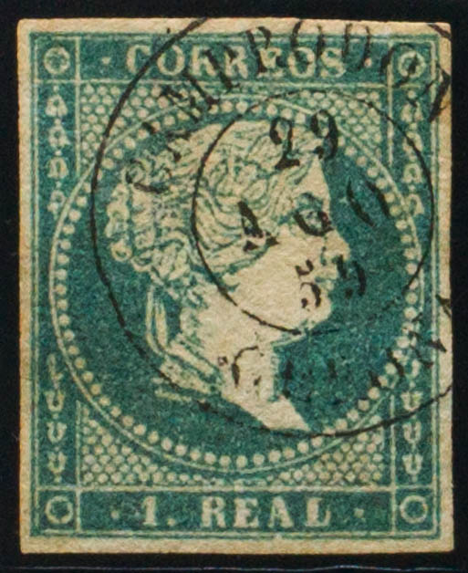 45. 1855. 1 real azul verdoso. Matasello CAMPRODON / GERONA. MAGNIFICO Y MUY RARO.