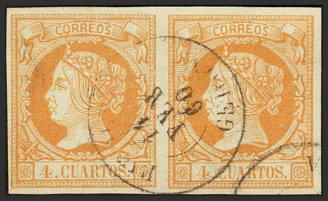 52(2). 1860. 4 cuartos amarillo, pareja. Matasello RIPOLL / GERONA. ESCASAMENTE LEGIBLE.