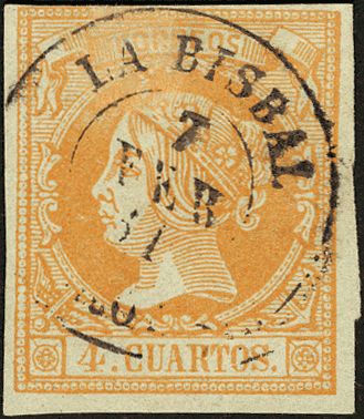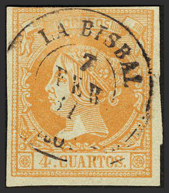 52. 1860. 4 cuartos amarillo. Matasello LA BISBAL / GERONA.