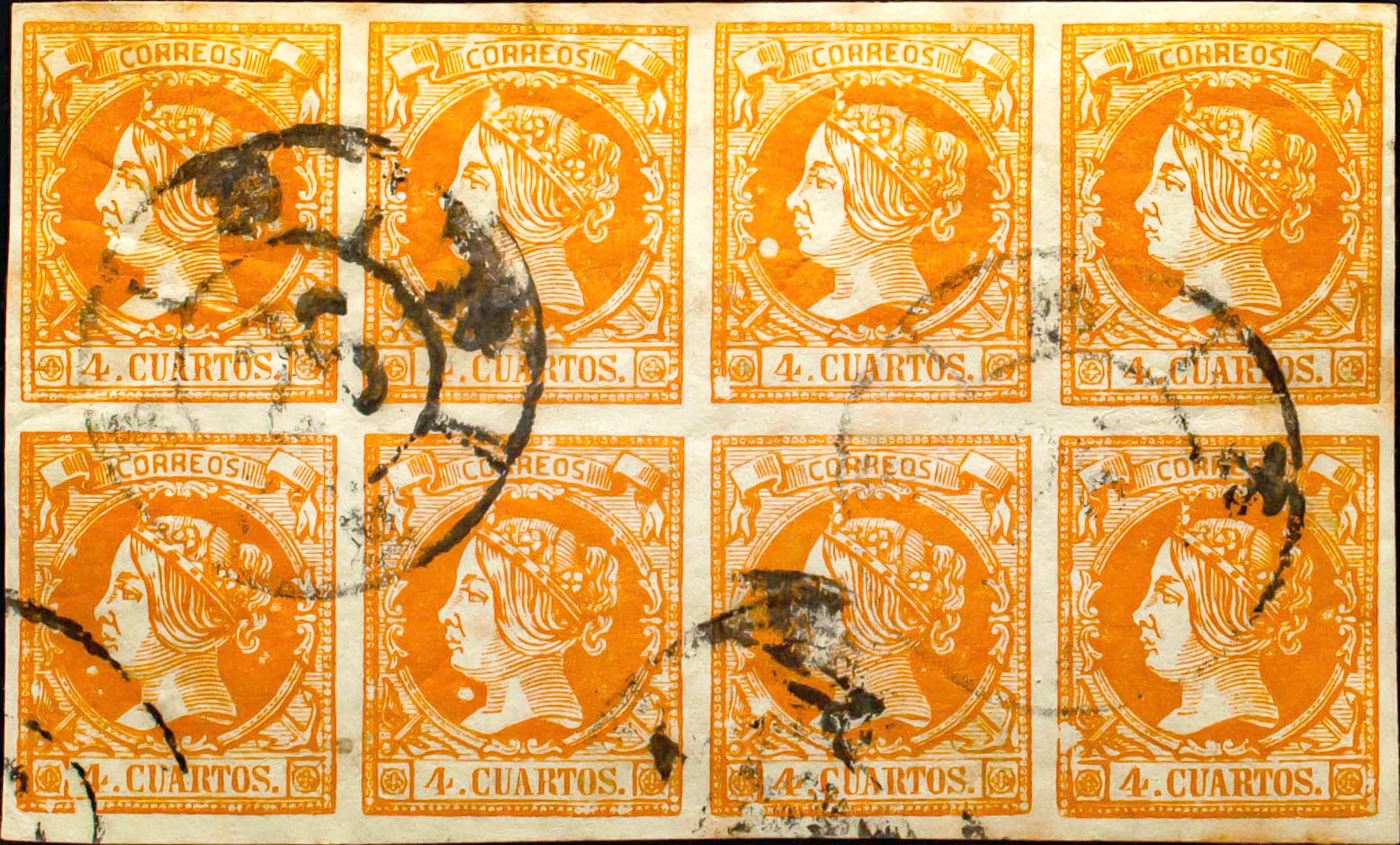 52(8). 1860. 4 cuartos amarillo, bloque de ocho. Matasello R.CARRETA Nº26, de Gerona. MAGNIFICO.