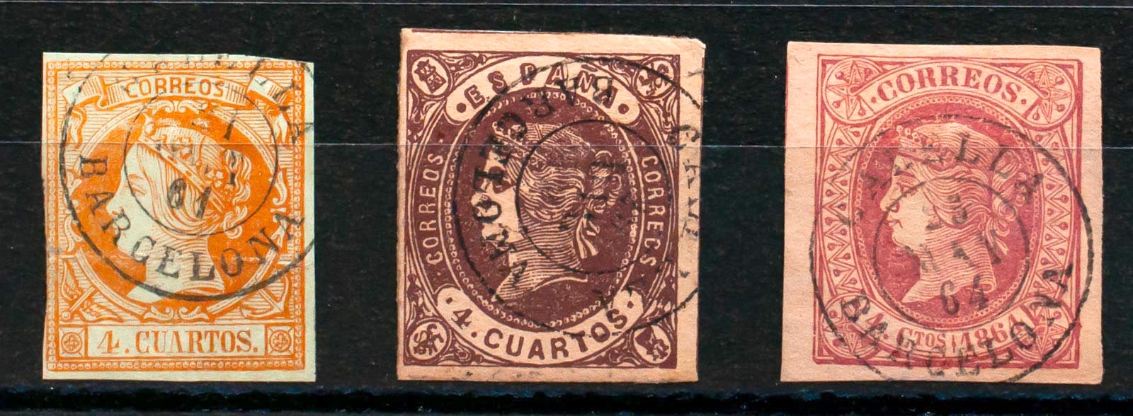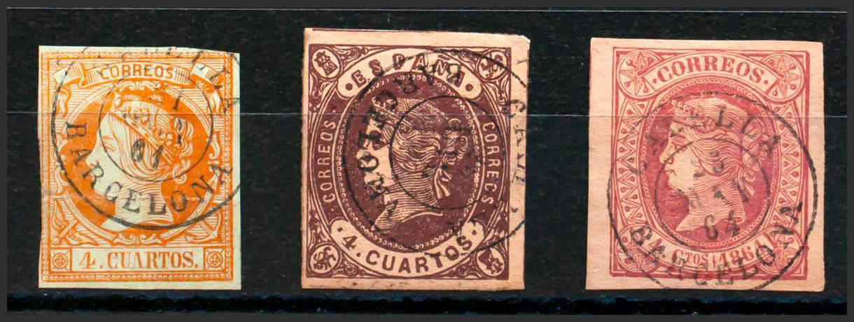 52, 58, 64. (1860ca). Conjunto de tres sellos del 4 cuartos amarillo, castaño y rosa, inutilizados con matasello CALELLA / BARCELONA. MAGNIFICO.