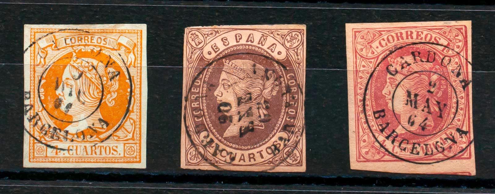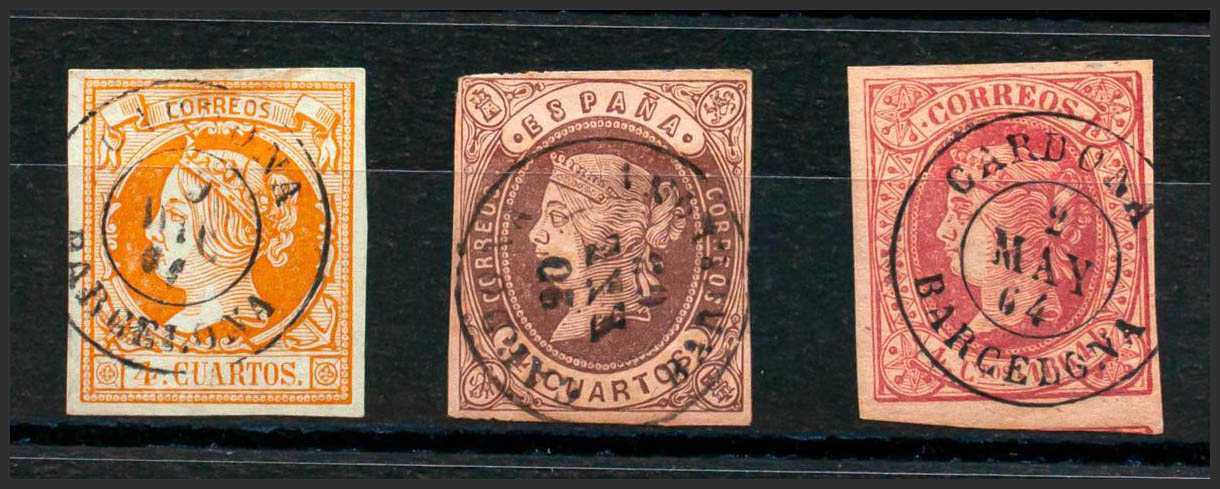 52, 58, 64. (1860ca). Conjunto de tres sellos del 4 cuartos amarillo, castaño y rosa, inutilizados con matasello CARDONA / BARCELONA. MAGNIFICO.
