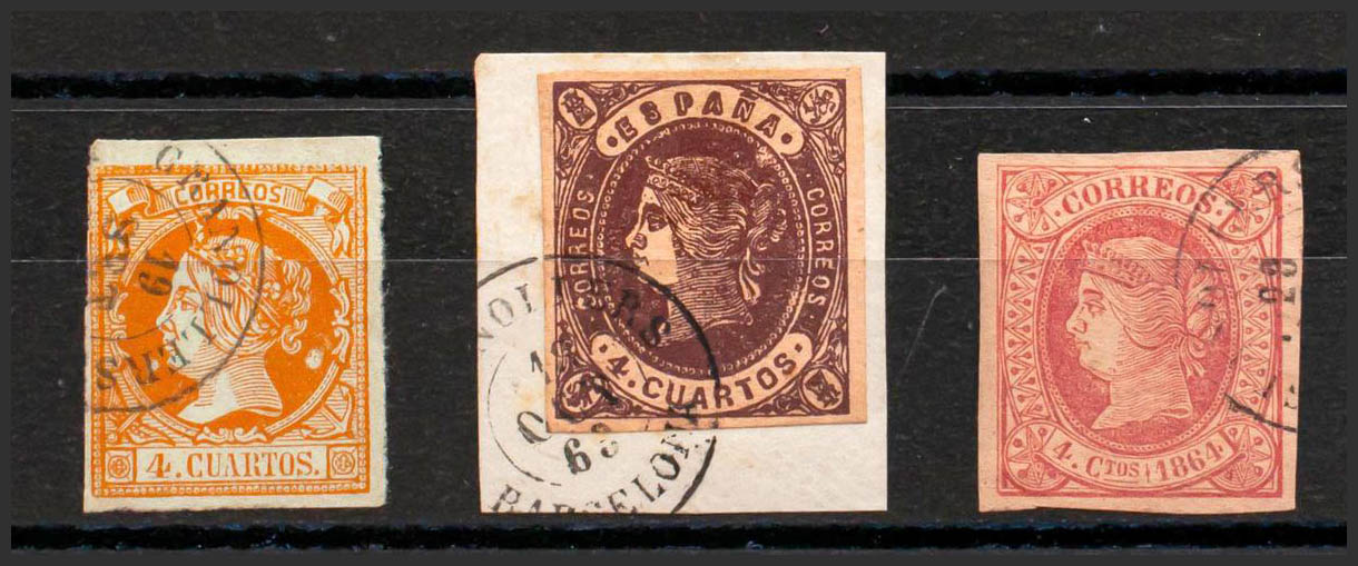 52, 58, 64. (1860ca). Conjunto de tres sellos del 4 cuartos amarillo, castaño y rosa, inutilizados con matasello GRANOLLERS / BARCELONA. MAGNIFICO.