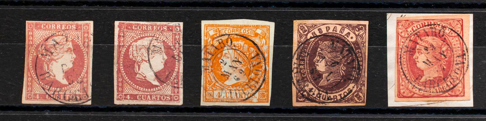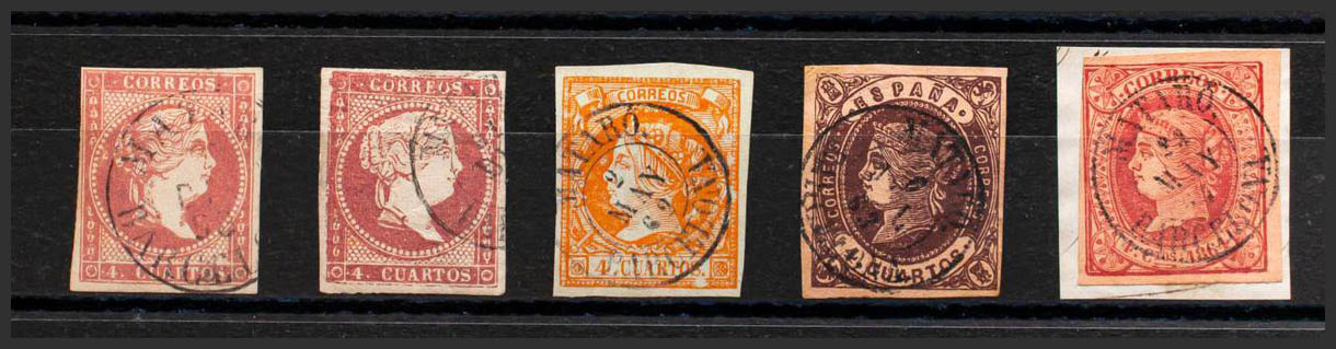 48(2), 52, 58, 64. (1855ca). Conjunto de cinco sellos del 4 cuartos rojo, amarillo, castaño y rosa, inutilizados con el matasello MATARO / BARCELONA (incluyendo el Tipo I sobre el 4 cuartos rojo). MAGNIFICO.