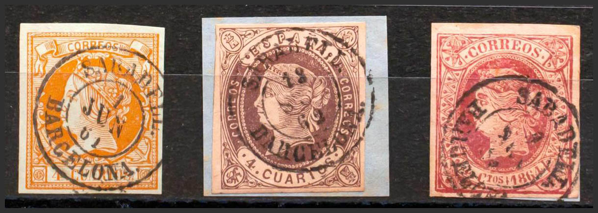 52, 58, 64. (1860ca). Conjunto de tres sellos del 4 cuartos amarillo, castaño y rosa, inutilizados con matasello SABADELL / BARCELONA. MAGNIFICO.