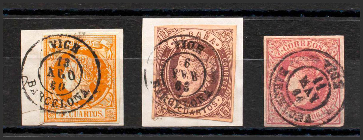 52, 58, 64. (1860ca). Conjunto de tres sellos del 4 cuartos amarillo, castaño y rosa, inutilizados con matasello VICH / BARCELONA. MAGNIFICO.