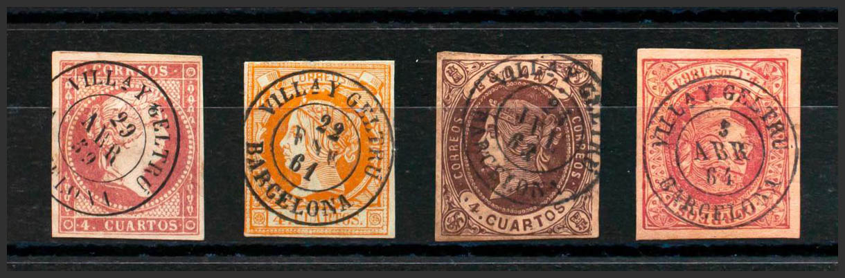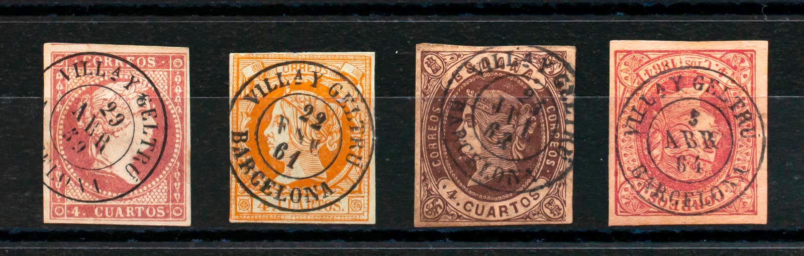 48, 52, 58, 64. (1855ca). Conjunto de cuatro sellos del 4 cuartos rojo, amarillo, castaño y rosa, inutilizados con el matasello VILLª Y GELTRU / BARCELONA. MAGNIFICO.