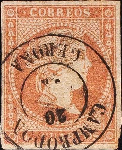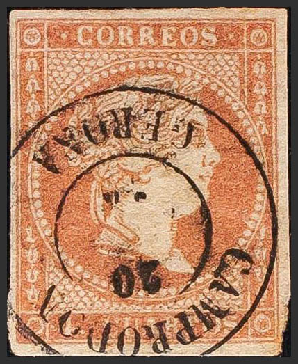 48. 1855. 4 cuartos rojo. Matasello CAMPRODON / GERONA. MAGNIFICO Y RARISIMO.