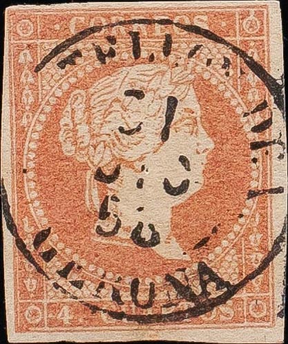 48. 1855. 4 cuartos rojo. Matasello CASTELLON DE A. / GERONA (Tipo I). BONITO Y MUY RARO.