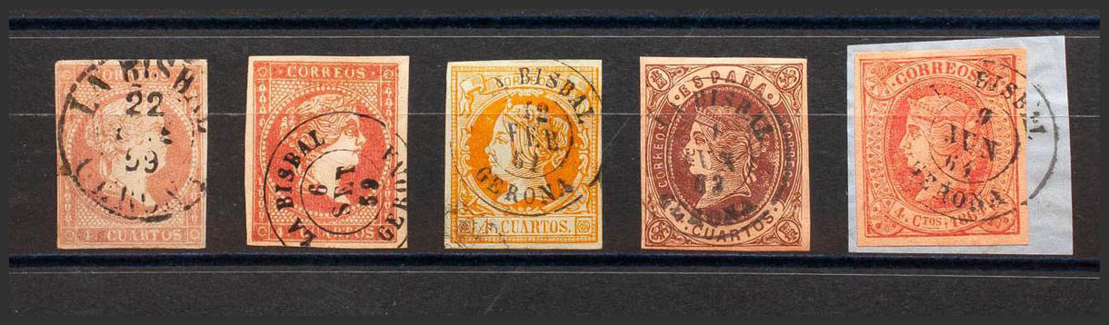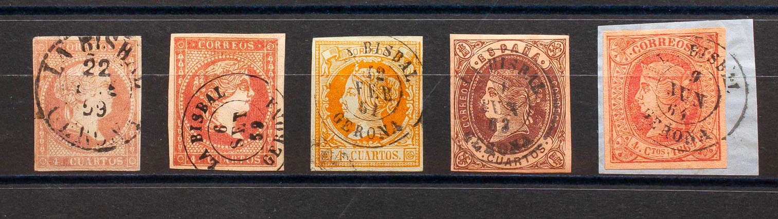 48(2), 52, 58, 64. (1855ca). Conjunto de cinco sellos del 4 cuartos rojo, amarillo, castaño y rosa, inutilizados con el matasello LA BISBAL / GERONA (incluyendo el Tipo I sobre el 4 cuartos rojo). MAGNIFICO.
