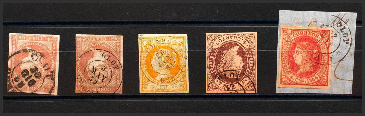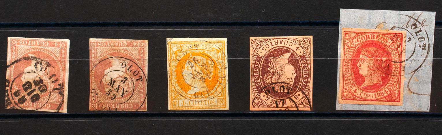 48(2), 52, 58, 64. (1855ca). Conjunto de cinco sellos del 4 cuartos rojo, amarillo, castaño y rosa, inutilizados con el matasello OLOT / GERONA (incluyendo el Tipo I sobre el 4 cuartos rojo). MAGNIFICO.