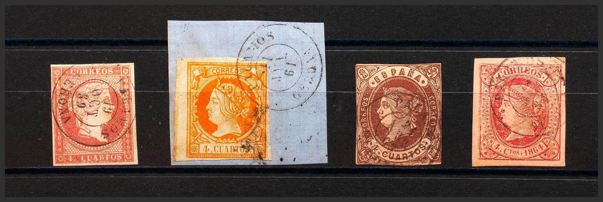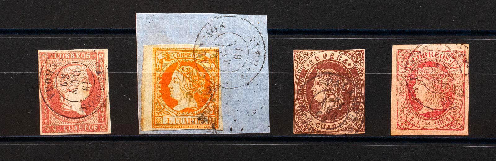 48, 52, 58, 64. (1855ca). Conjunto de cuatro sellos del 4 cuartos rojo, amarillo, castaño y rosa, inutilizados con matasello PALAMOS / GERONA. MAGNIFICO.