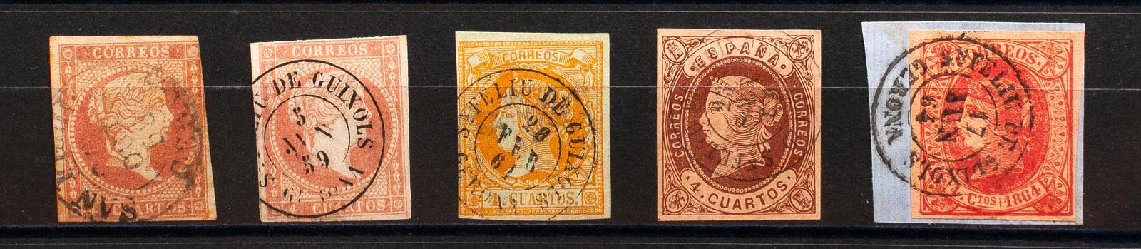48(2), 52, 58, 64. (1855ca). Conjunto de cinco sellos del 4 cuartos rojo, amarillo (en pareja), castaño y rosa, inutilizados con el matasello SAN FELIU DE GUIXOLS / GERONA (incluyendo el Tipo I sobre el 4 cuartos rojo). MAGNIFICO.