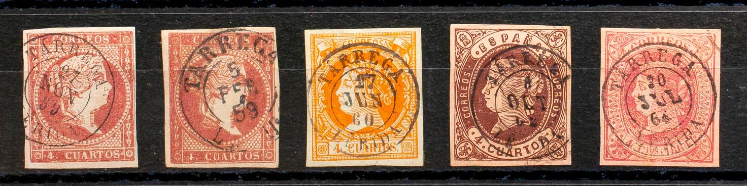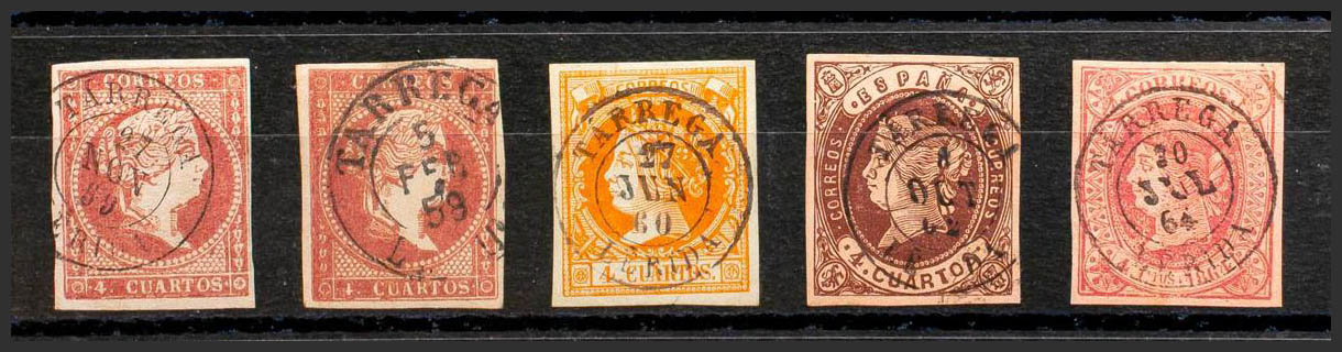 48(2), 52, 58, 64. (1855ca). Conjunto de cinco sellos del 4 cuartos rojo, amarillo, castaño y rosa, inutilizados con el matasello TARREGA / LERIDA (incluyendo el Tipo I sobre el 4 cuartos rojo). MAGNIFICO.