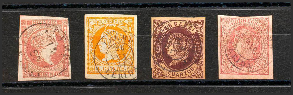 48, 52, 58, 64. (1855ca). Conjunto de cuatro sellos del 4 cuartos rojo, amarillo, castaño y rosa, inutilizados con matasello TREMP / LERIDA (el 4 cuartos rojo Tipo I). MAGNIFICO.