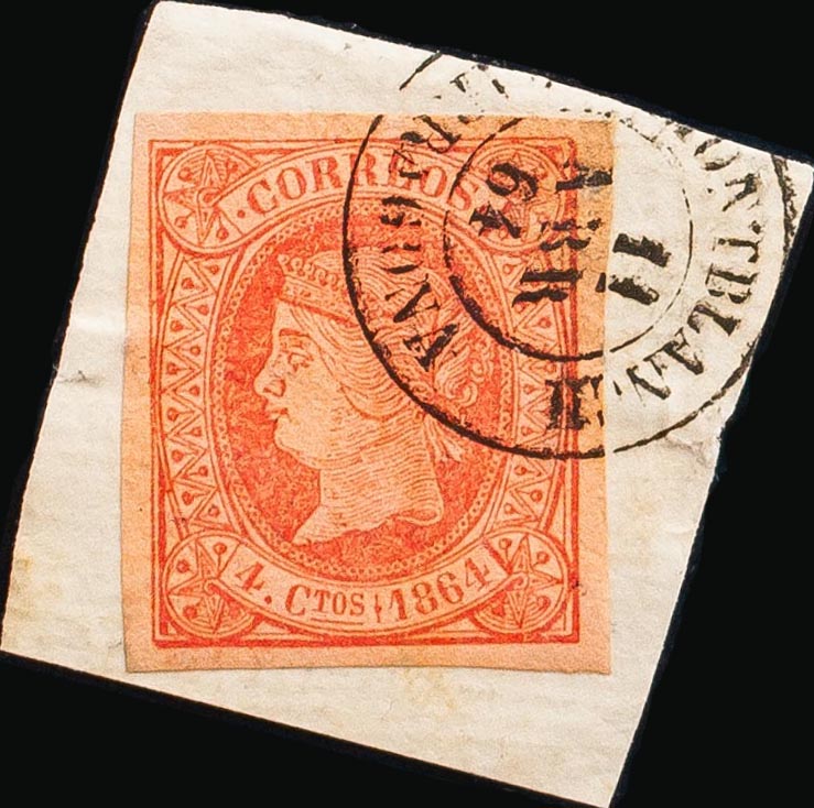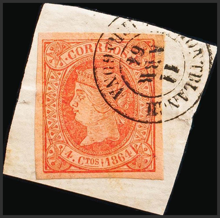 △ 64. 1864. 4 cuartos rosa, sobre fragmento. Matasello MONTBLANCH / TARRAGONA. MAGNIFICO.