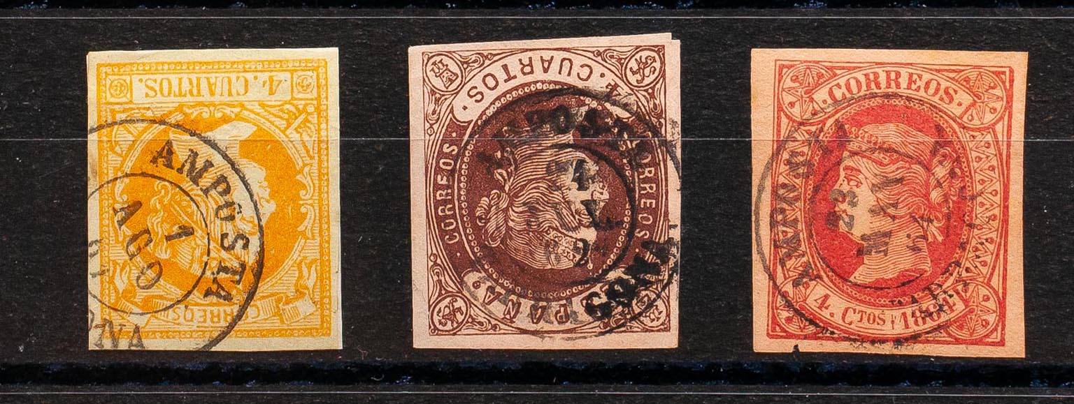 52, 58, 64. (1860ca). Conjunto de tres sellos del 4 cuartos amarillo, castaño y rosa, inutilizados con el matasello AMPOSTA / TARRAGONA. MAGNIFICO.