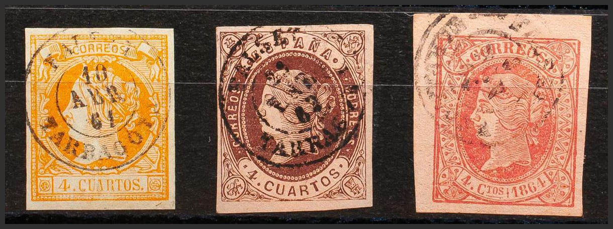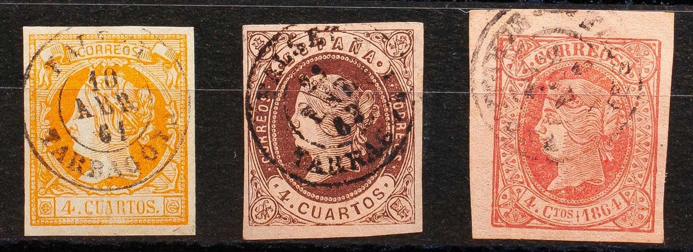 52, 58, 64. (1860ca). Conjunto de tres sellos del 4 cuartos amarillo, castaño y rosa, inutilizados con el matasello FALSET / TARRAGONA. MAGNIFICO.