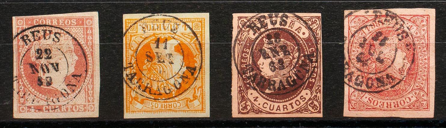 48, 52, 58, 64. (1855ca). Conjunto de cuatro sellos del 4 cuartos rojo, amarillo, castaño y rosa, inutilizados con matasello REUS / TARRAGONA. MAGNIFICO.