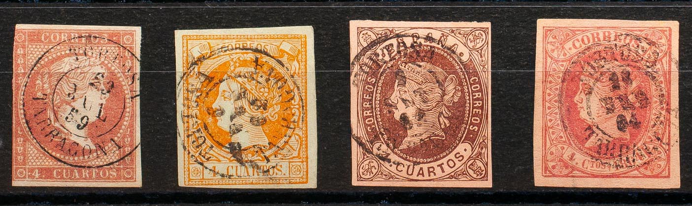 48, 52, 58, 64. (1855ca). Conjunto de cuatro sellos del 4 cuartos rojo, amarillo, castaño y rosa, inutilizados con matasello TORTOSA / TARRAGONA. MAGNIFICO.