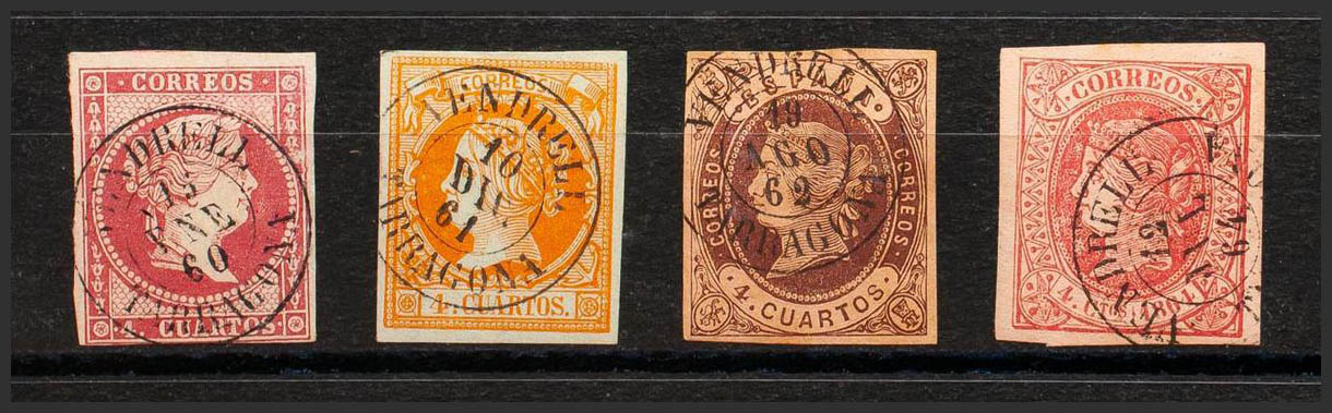 48, 52, 58, 64. (1855ca). Conjunto de cuatro sellos del 4 cuartos rojo, amarillo, castaño y rosa, inutilizados con matasello VENDRELL / TARRAGONA. MAGNIFICO.