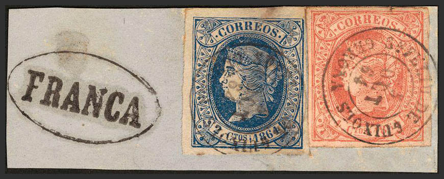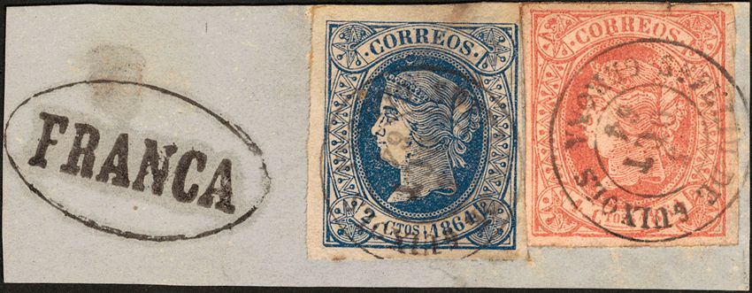 △ 63, 64. 1864. 2 cuartos azul y 4 cuartos rosa, sobre fragmento. Matasello SN. FELIU DE GUIXOLS / GERONA, en el frente marca "FRANCA". MAGNIFICO.